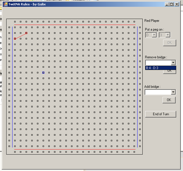 Une fois le pilier placé, on dispose de deux listes déroulantes qui affichent la liste des ponts que l'on peut enlever, et ceux qu'on peut rajouter. Les listes sont mises à jour par rapport aux ajouts / retraits. On passe la main avec le bouton "End of Turn". Si un joueur gagne, un message l'indique, et pouf, c'est fini !