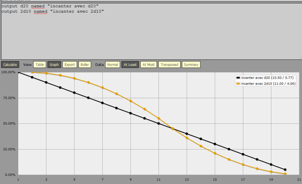 Ce site, donc, permet de faire pleins de calculs basés sur les dés, de les comparer, de connaître le pourcentage de réussite d'un jet, et pleins d'autres trucs. Par exemple, à Dungeons & Dragons 5, mon barde, quand il lance Onde de Choc, nécessite un test de Constitution de la part de tous ceux proches de lui. La difficulté est de 13 (pour l'instant).