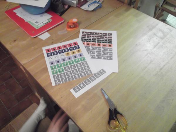 Tous ces petits bouts de papier découpés doivent ensuite être collés aux pastilles en plastique. C'est vraiment un jeu d'enfant (j'en ai d'ailleurs utilisé un pour en faire une partie), il faut juste prendre le pli car une fois collé, ça ne bouge plus.
